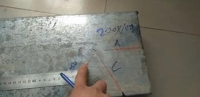 我們來先看第一種做法,我們要做的大小頭是200X100大小頭,我們來畫第一條線來確定橋架大小頭的大小,用A來代表這條線,畫完A線后我們畫B線,A線是用來區分變徑大小的,B線可隨意畫,畫完后測量B線長度,長度大概是12公分,確定B線長度來畫C線點,