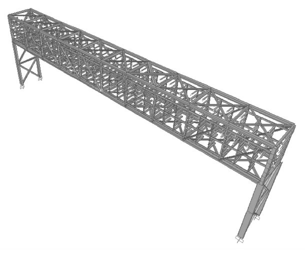 分析軟件采用SAP2000 有限元分析軟件。過河橋架通廊采用簡支方式落在柱子上,柱子與基礎采用剛接柱腳。雖然過河橋架兩端分別有其他跨連接, 但其他跨的存在主要對柱子內力產生影響,對橋架本身影響可以忽略,因此分析僅取過河段進行研究。SAP2000 中地震荷載模式下,其結構阻尼比默認為0.05,對于鋼結構,調整為0.035。桁架落在兩側鋼柱頂的位置,將其節點的彎矩約束釋放,從而為鉸接。橋架分析整體模型如圖5 所示。